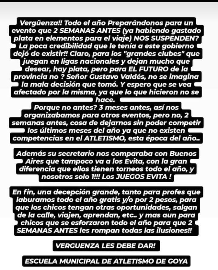 La Escuela Municipal de Atletismo de Goya expresó un fuerte repudio tras la sorpresiva suspensión de los Juegos Evita, a solo dos semanas de su realización. Según manifiestan, la decisión tomada por el gobierno provincial, encabezado por el gobernador Gustavo Valdés, generó una profunda decepción tanto en los profesores como en los jóvenes atletas que venían preparándose durante todo el año para competir en este evento clave.