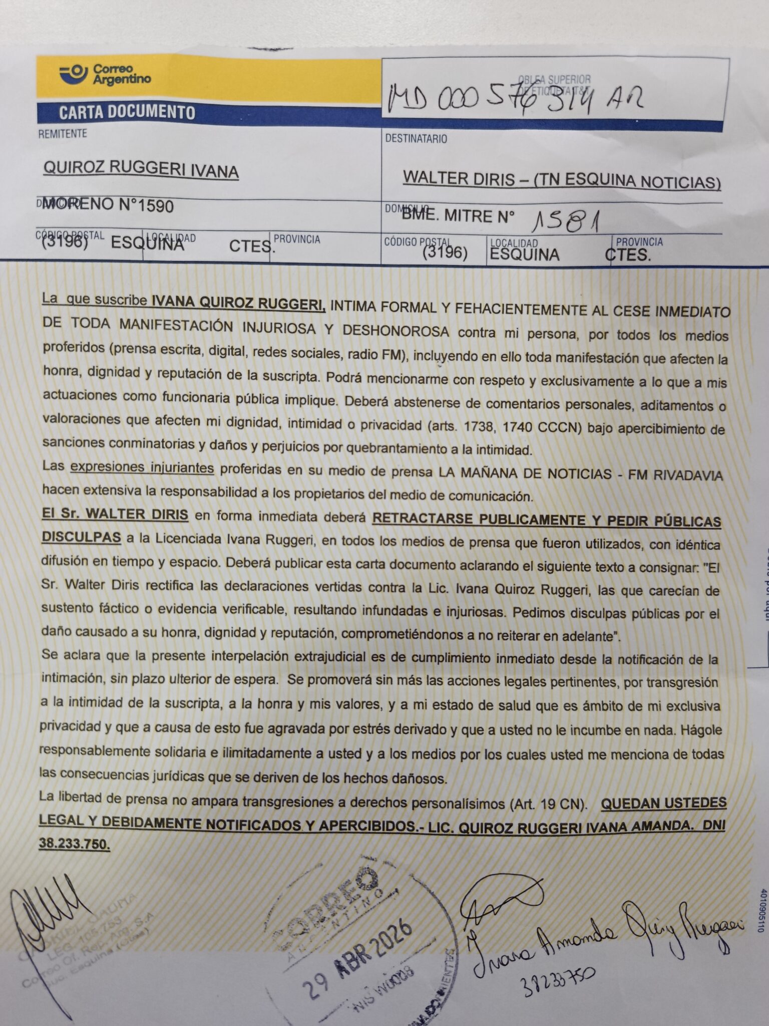 ​En un claro e inmediato intento de intimidación, la concejal y actual jefa del PAMI local, Lic. Ivana Quiroz Ruggeri, ha enviado una carta documento recibida este jueves 30 de abril dirigida a este medio. TN Esquina recibe esta notificación no como un pedido de rectificación legítimo, sino como una herramienta de censura previa. La misiva pretende dictar qué podemos y qué no podemos decir sobre su gestión, exigiendo incluso una retractación con palabras redactadas por ella misma, lo que constituye un atropello inaceptable a nuestra independencia editorial.