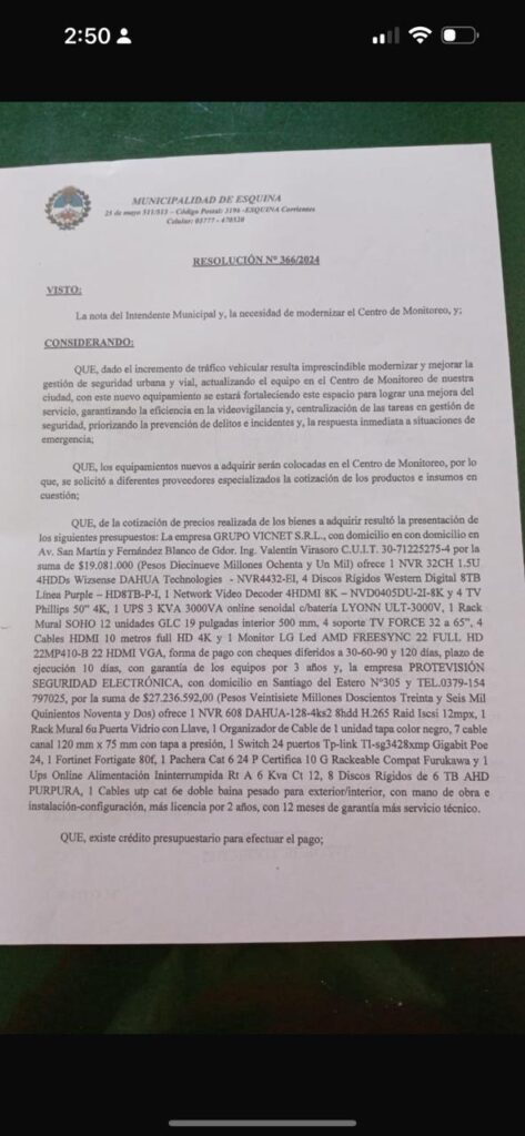 Al mediodía de este viernes, la Justicia solicitó a la Municipalidad de Esquina un informe sobre una operación puntual vinculada a la compra de equipamiento. Desde la Secretaría de Hacienda se entregó toda la documentación respaldatoria, incluyendo facturas, comprobantes, registros de ofertas y otros elementos vinculados al proceso de adquisición.