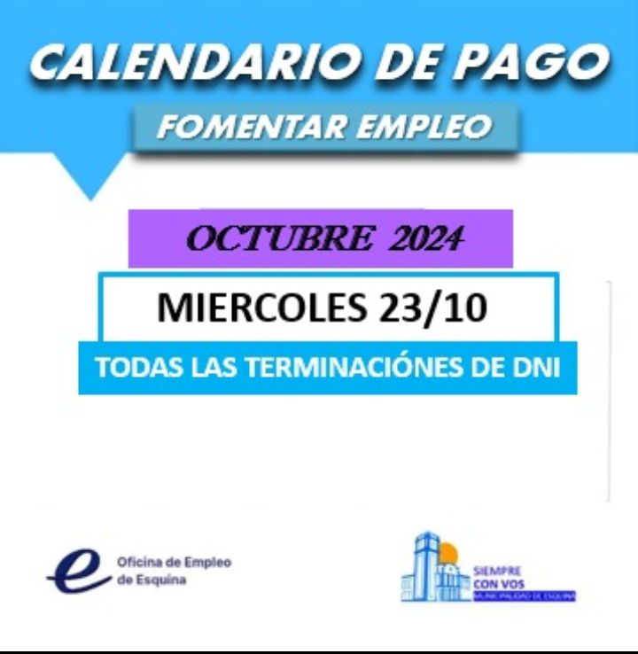 Desde la Oficina de Empleo de la municipalidad de Esquina se informó la fecha de pago correspondiente a la Liquidación de Octubre 2024, que corresponde al devengado del mes de septiembre de este año. El pago para todas las terminaciones de DNI se realizará el miércoles 23 de octubre y está destinado a los beneficiarios del Programa Fomentar Empleo, que incluye tanto las pasantías laborales como los cursos de capacitación laboral ofrecidos a lo largo del año.