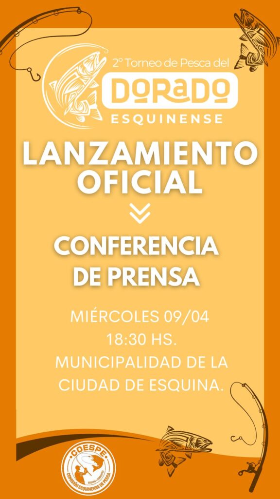 La Comisión de Pesca de la localidad de Esquina se complace en anunciar el lanzamiento oficial del 2do Torneo de Pesca del Dorado Esquínense. Este esperado evento tendrá lugar el miércoles 9 de junio a las 18:30 horas en la municipalidad, justo antes de la sesión del Honorable Concejo Deliberante.