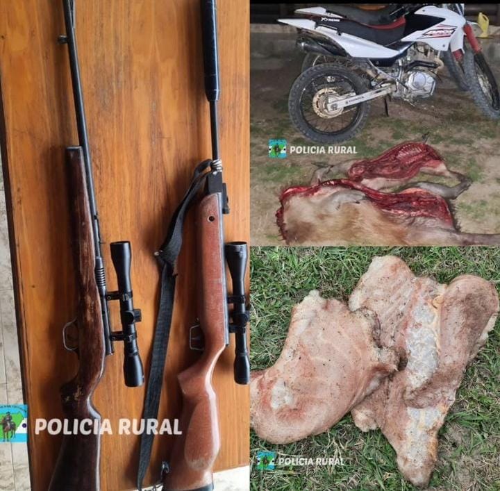 Durante el control, las autoridades interceptaron a los tres individuos, quienes viajaban en dos motocicletas y transportaban carpinchos faenados y restos de carne de yacaré, especies que se encuentran bajo protección debido a su estado vulnerable. Además, se hallaron tres armas de aire comprimido modificadas para disparar proyectiles calibre 22 mm, lo cual constituye un delito de tenencia y portación ilegítima de armas de fuego, ya que los sujetos no pudieron presentar la documentación correspondiente.