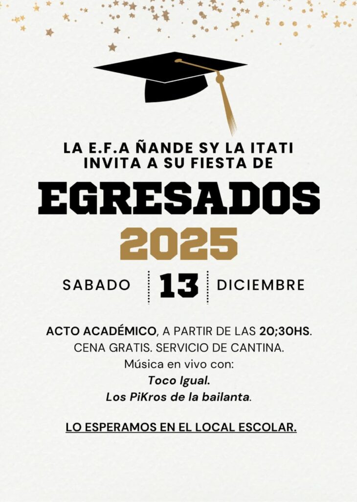 La emoción se siente en el aire en la Escuela E.F.A ÑANDE SY LA ITATI, donde alumnas de 7° año están a punto de despedir una etapa importante de sus vidas. Con el acto académico programado para el sábado 13 de diciembre a las 20:30 horas, los preparativos para la fiesta de Egresados 2025 están en pleno apogeo.