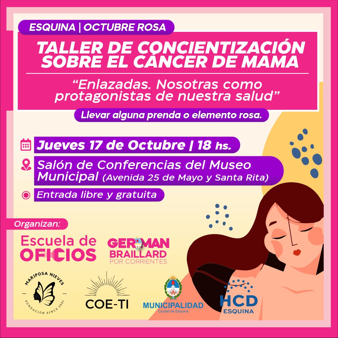 En el marco de la campaña “Octubre Rosa”, la Municipalidad de Esquina invita a la comunidad a participar del Taller de Concientización sobre el Cáncer de Mama titulado “Enlazadas. Nosotras como protagonistas de nuestra salud”. Este importante evento se llevará a cabo el próximo jueves 17 de octubre a las 18 horas en el Salón de Conferencias del Museo Municipal, ubicado en Avenida 25 de Mayo y Santa Rita.